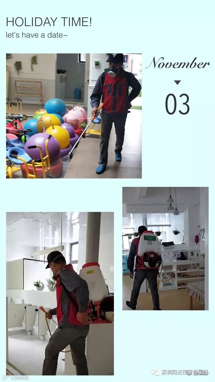 秋季是各种流行性疾病的突发时节,为预防蚊、蝇、鼠、跳蚤类等病媒生物的孳生,消灭传染性病原,保证师幼学习、生活和办公环境的安全、卫生。2018年11月3日,阳光花澜汇居幼儿园请了专业灭四害消杀公司开展《全园灭四害消杀》工作。对全园活动室、游戏室、寝室、盥洗室及周边环境等进行定期消杀,采用喷雾器药物消杀方法,消毒过程中,工作人员严格按照操作规范进行喷洒,不放过一处卫生死角,彻底消灭蚊蝇、鼠患,尽最大的努力切断了四害孳生地。