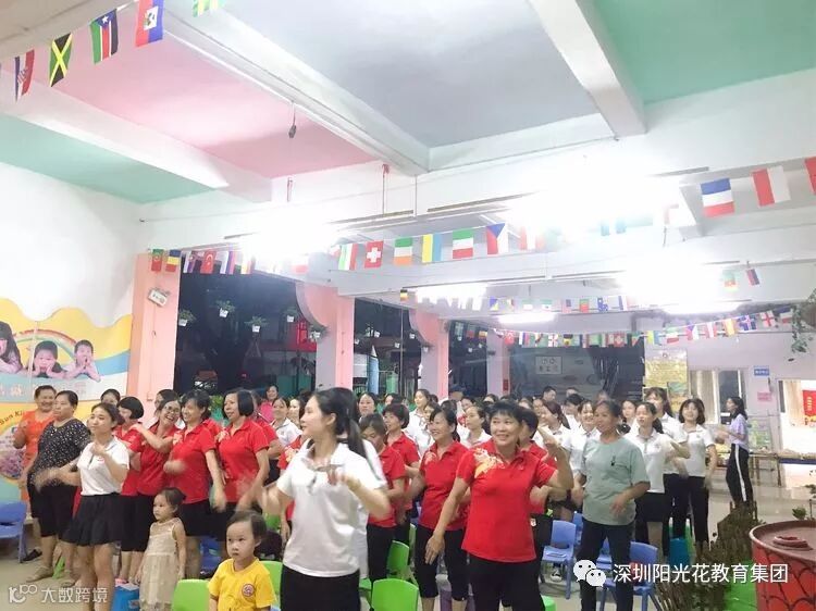 由我们的律动老师带着我们全体教职员工跳园歌律动开启今天的活动