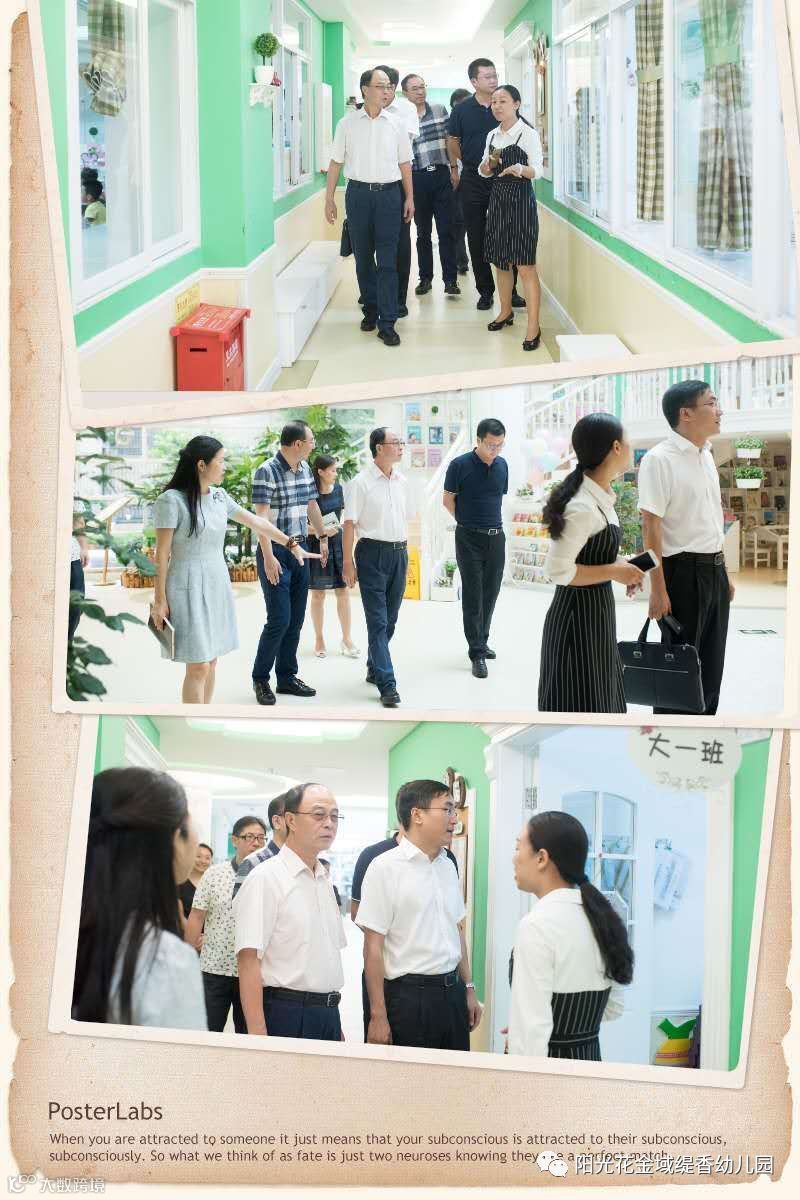 2018年9月3日上午,市、区两级教育局工作者莅临我园指导工作,阳光花教育集团王超先生、林丽清总园长、叶华总监、王赟部长高度重视,亲临现场。市、区两级教育局工作者在孔月琴园长及集团领导一行人的陪同下,参观了金域缇香幼儿园园所环境,我们的小小解说员赵培焯小朋友,更是自信大方,一路引领着市、区两级教育局工作者对户外、室内及绘本馆、美工馆、科学馆等功能室进行了参观视察。对金域缇香幼儿园的环境给予了肯定,赞扬了园所硬件设施好,环境优美。