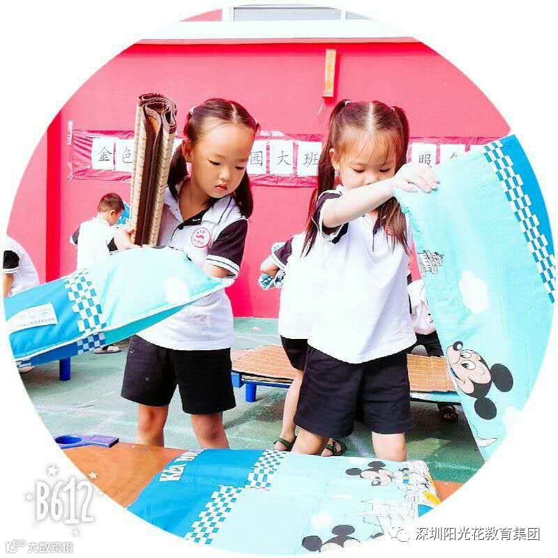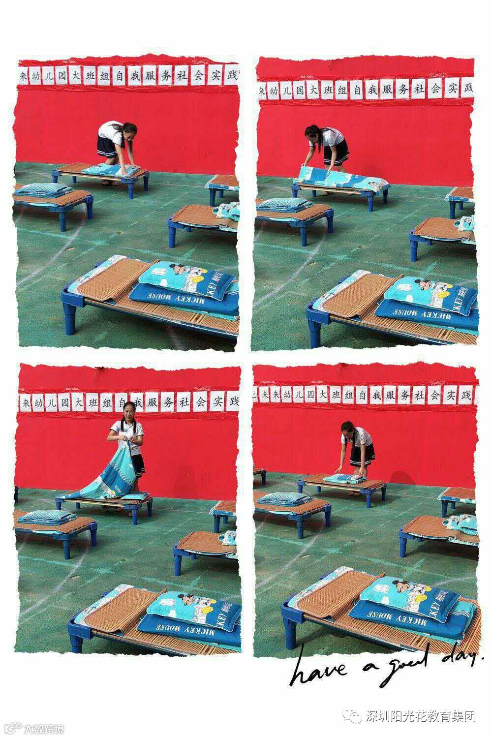 自我服务--我是好帮手,叠被子比赛开始啦!张老师在给小朋友们示范正确的叠被子方法。