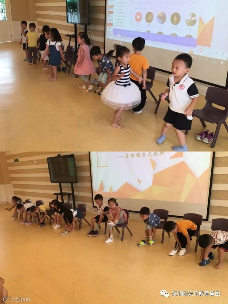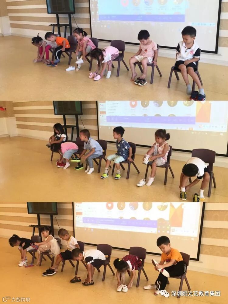 本次比赛,分成五组,当听到老师“预备开始”,随着一声口令,孩子们全神贯注地投入到比赛中,把自己的小鞋子脱下来整齐地摆放在地上,再从新穿上鞋子。有的小朋友着急穿反了;有的小朋友迅速穿好了......孩子们的种种表现引起了阵阵笑声和“加油”呐喊声。穿好鞋的孩子立刻跑到指定位置坐下。