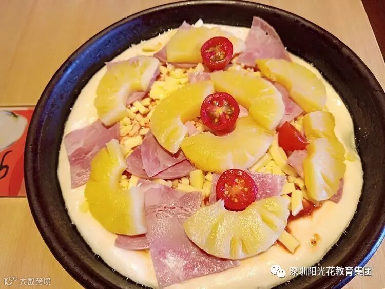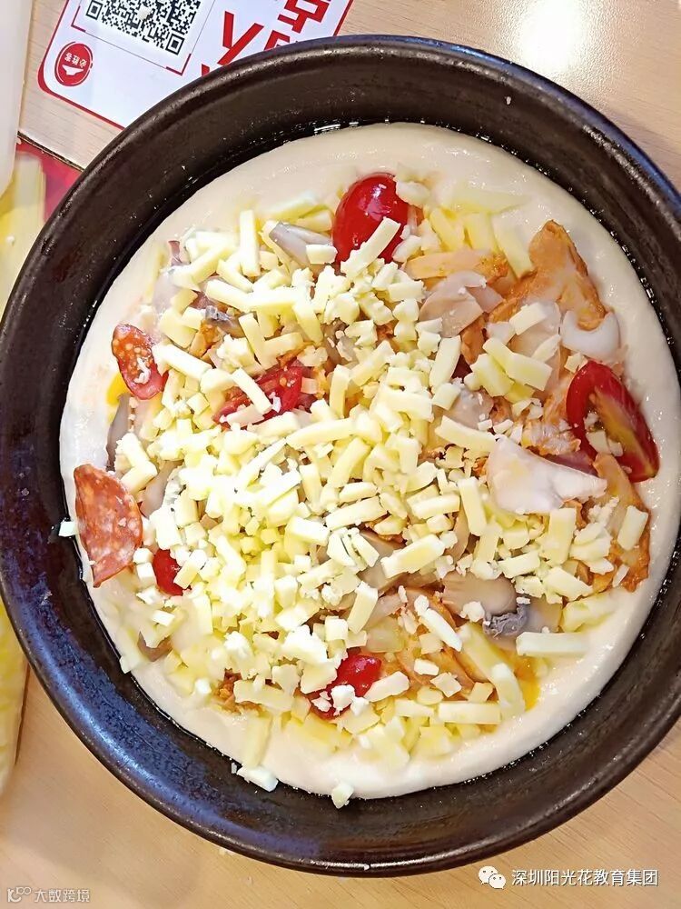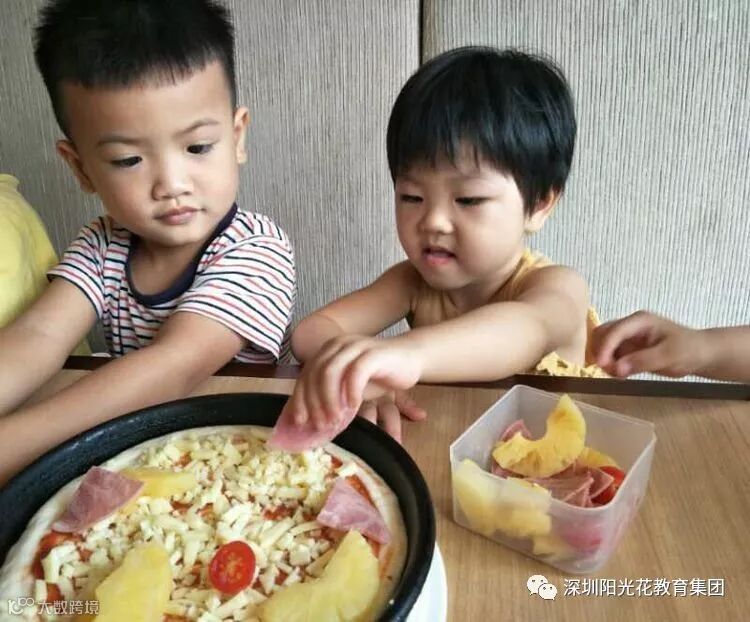 瞧!孩子们多能干啊!小心翼翼地抓起芝士往披萨饼上撒,紧接着又放火腿,鸡肉,不一会儿披萨饼上就铺满了各色各样的食材,好似一幅漂亮的画卷。