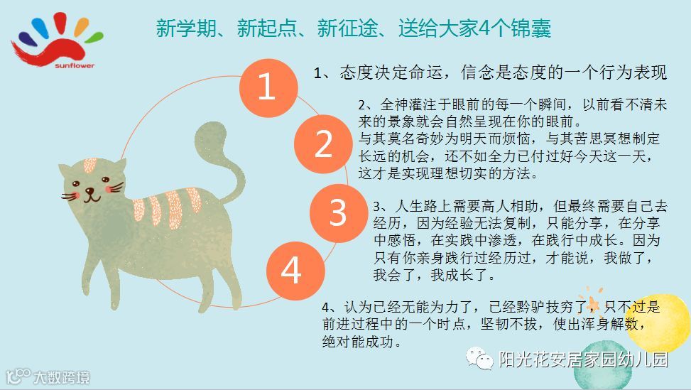 新学期、新起点、新征途,张园长为我们新学期送来了四个锦囊,也是送给彼此的爱的鼓励,让我们携手共进,互相支持,继续前进!