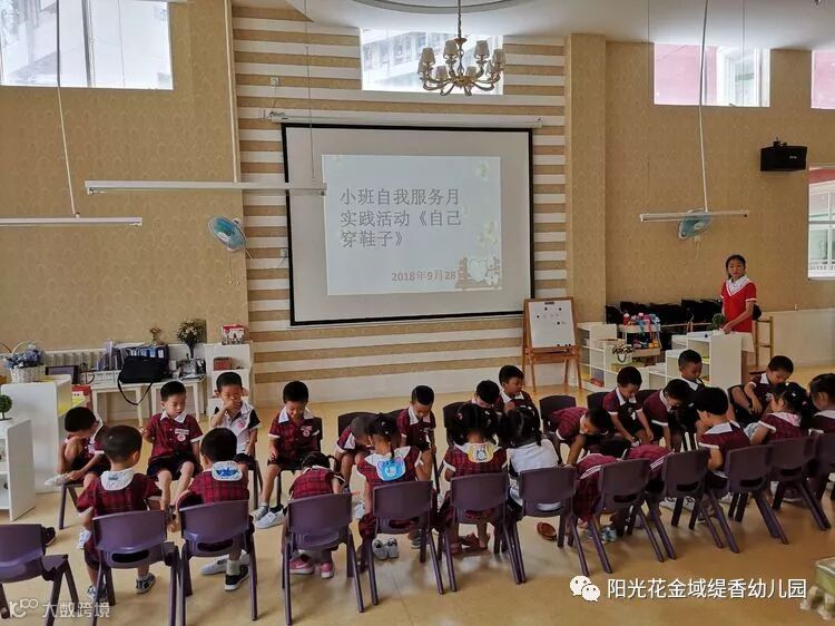 此次活动分为四个自我服务主题进行:小一班自己背书包,小二班自己叠毛巾,小三班自己穿鞋子,小四班自己刷牙。