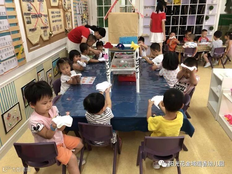 在孩子们共同努力下,我们幼儿园的扶手被擦得干干净净,焕然一新。来把目光转到我们的班级里。我是好帮手,我也热心肠,我能帮助我身边的小朋友垫汗巾。