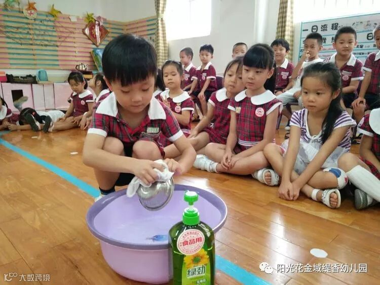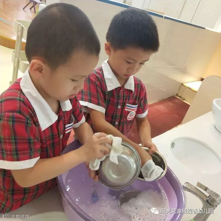活动分为三个主题:大三、大四班我会洗碗、大五班自己整理书包、大一、大二班我来擦大型玩具。