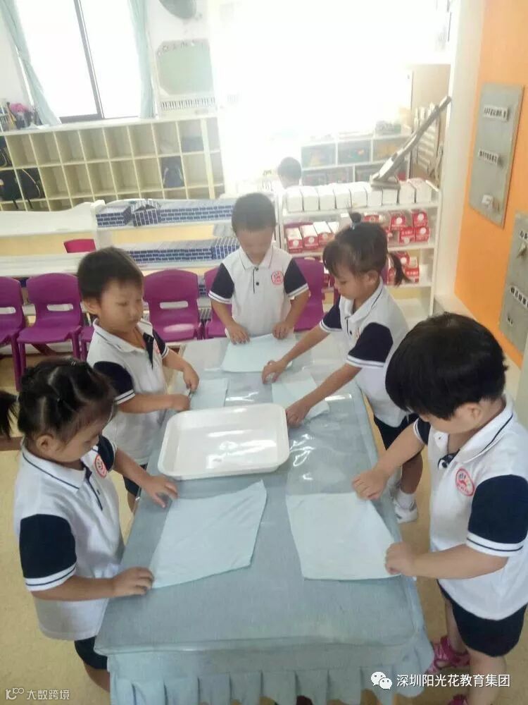 叠毛巾比赛。角对角,边对边,叠好啦!