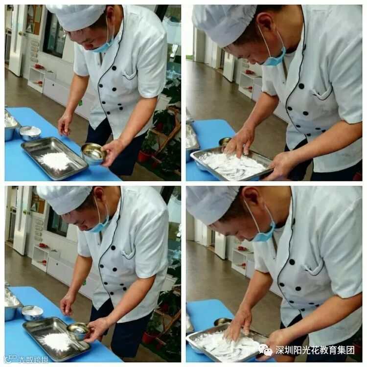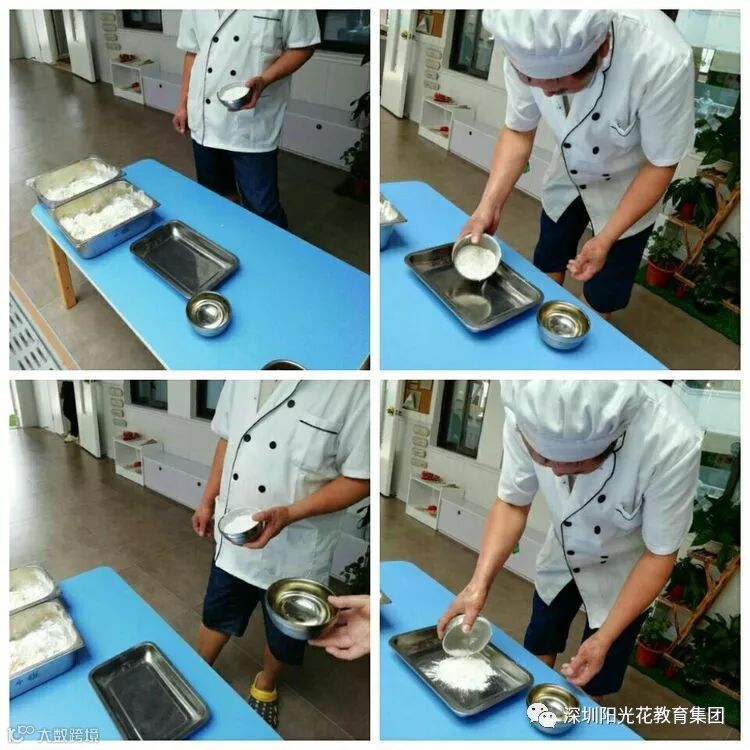 下面呢,我们需要开始制作饼干哦,但是呢,我们不会做,所以下面有请我们的厨师叔叔先来给我们做个示范,先告诉我们的小朋友们如何正确的和面以及和面过程中需要注意的事项,先准备好一碗面粉和一碗水,和面的课堂开始啦!