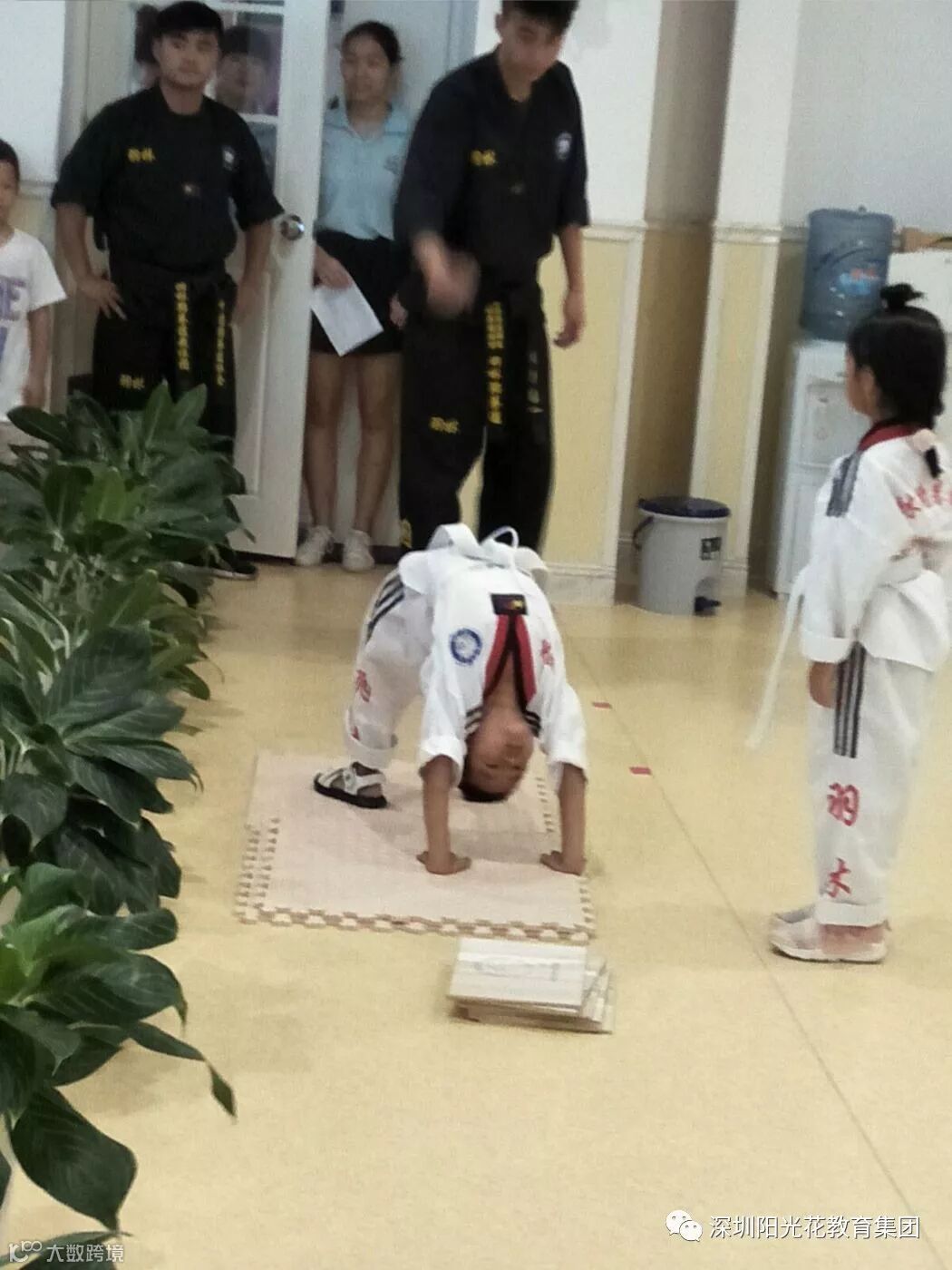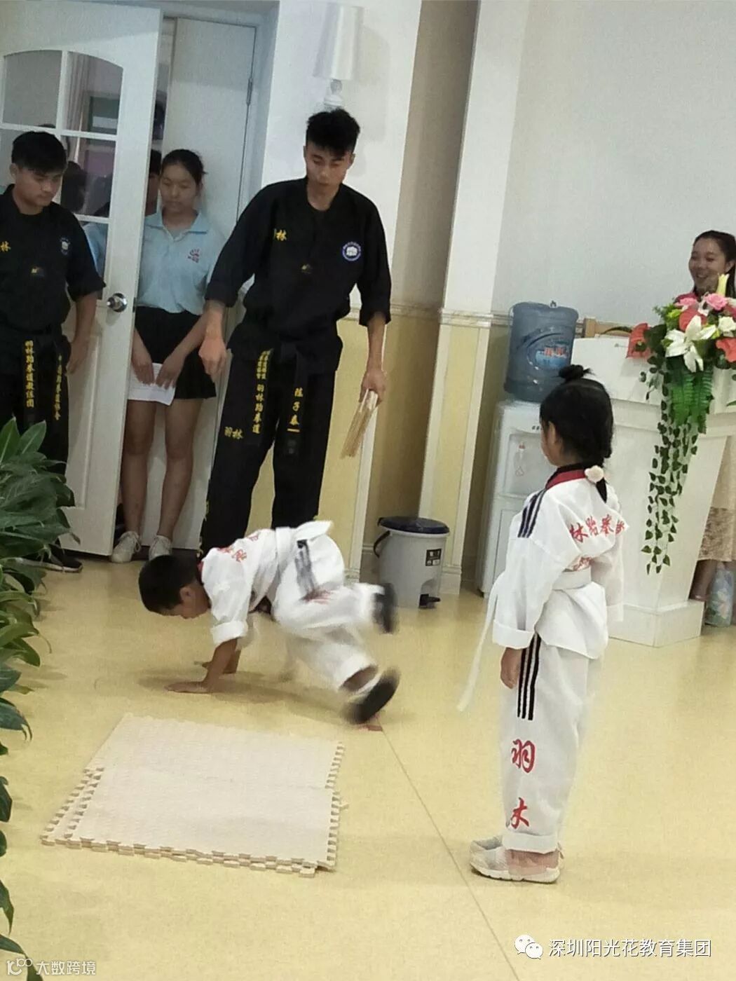 第二环节:跆拳道展示。我们的跆拳道教练来自羽林,是以礼仪礼貌教学方式为主。展示的内容有下腰、前滚翻、青蛙趴、扫腿以及上踢高度到头的动作。
