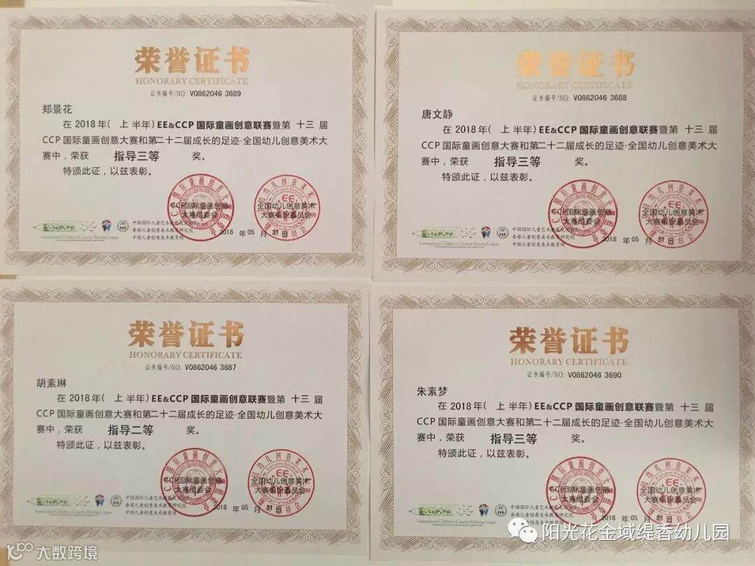 【喜报】恭贺金域缇香幼儿园在2018年(上半年)EE&CCP国际童画创意联赛暨第十三届CCP国际童画创意大赛和第二十二届成长的足迹·全国幼儿创意美术大赛中,荣获“集体特等奖”,恭贺孔月琴园长荣获“组织特等奖”,胡素琳老师荣获“指导二等奖”,朱素梦、唐文静和郑景花老师荣获“指导三等奖”。恭喜刘彦希、李可瑞、贺梓馨、兰靖童、刘明轩等188名幼儿分别荣获特等奖、优秀奖、一等奖、二等奖和三等奖,特此祝贺!