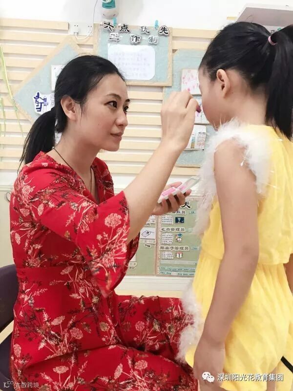 今天家长义工早早来到了幼儿园,为孩子们穿上漂亮的表演服装,化上美美的妆,协助老师做好表演前的相关准备。