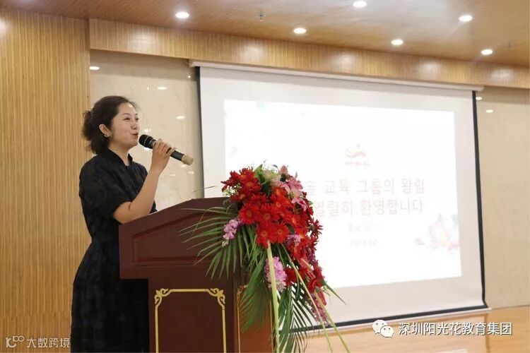 在座谈会上,主持人詹钟哲老师分别用中文和韩文致欢迎辞和活动流程介绍,王清董事、叶华总监、李建惠主任分别向韩国客人介绍了阳光花教育集团的企业文化、素养课程以及艺术口才特色课程。他们被阳光花教育集团立足本土、面向国际的课程建构理念,立于前沿的教育,勤恳敬业、睿智进取的工作精神以及以幼儿为本、精于教学的实践智慧所感动和感染。尤其对艺术口才课程表现出浓厚的兴趣,表示希望能够机会将此分享给韩国教育同行,进行汉语教学。