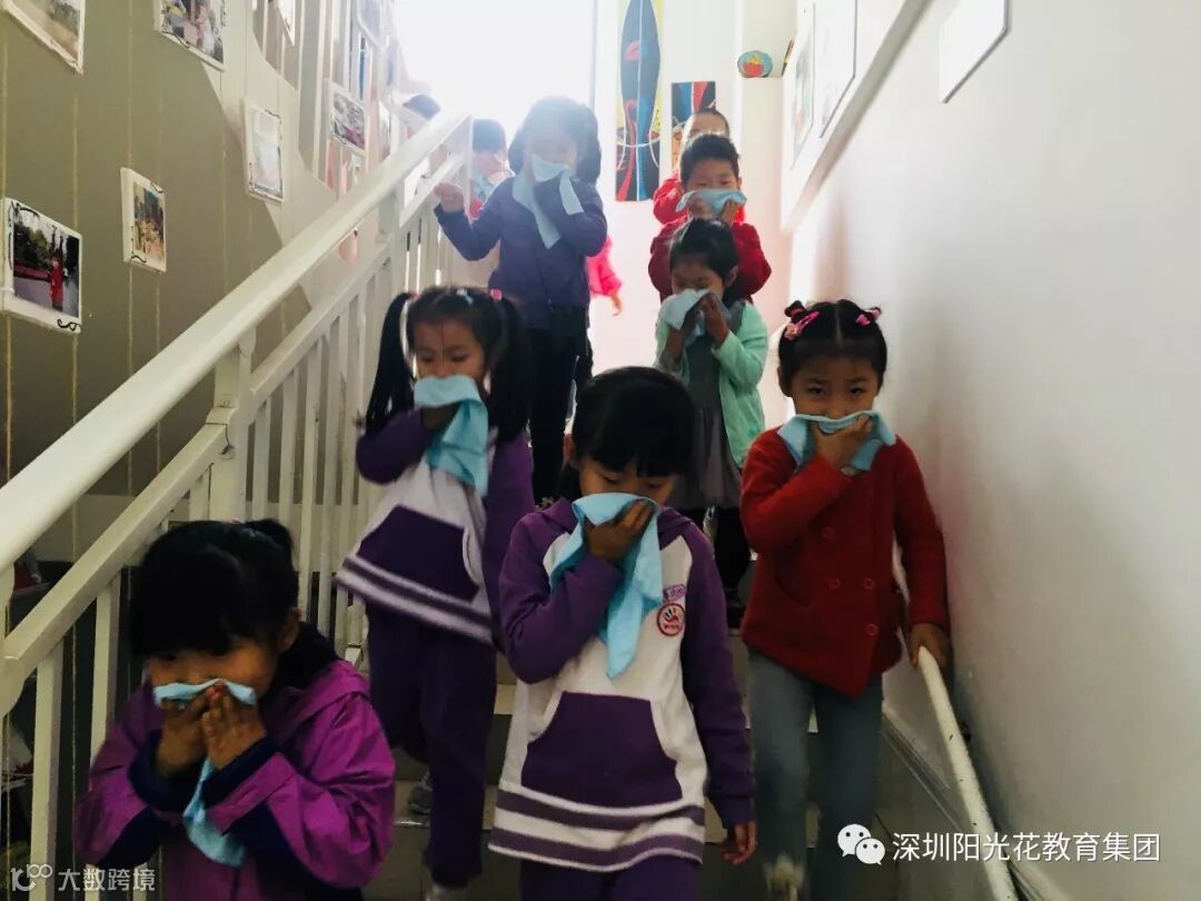 在各班正常的组织开展一日活动时,火灾警报器紧急响起,全园的幼儿在班级老师的指挥下,在班级里拿上湿毛巾,轻轻捂住口鼻,身子放低,速度有序的从安全出口逃教室,到达一楼操场安全场地,清点人数后向总指挥示意。