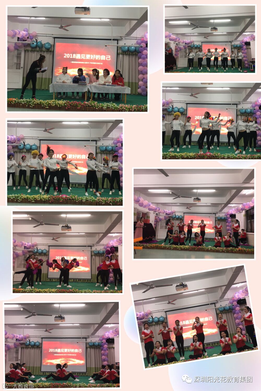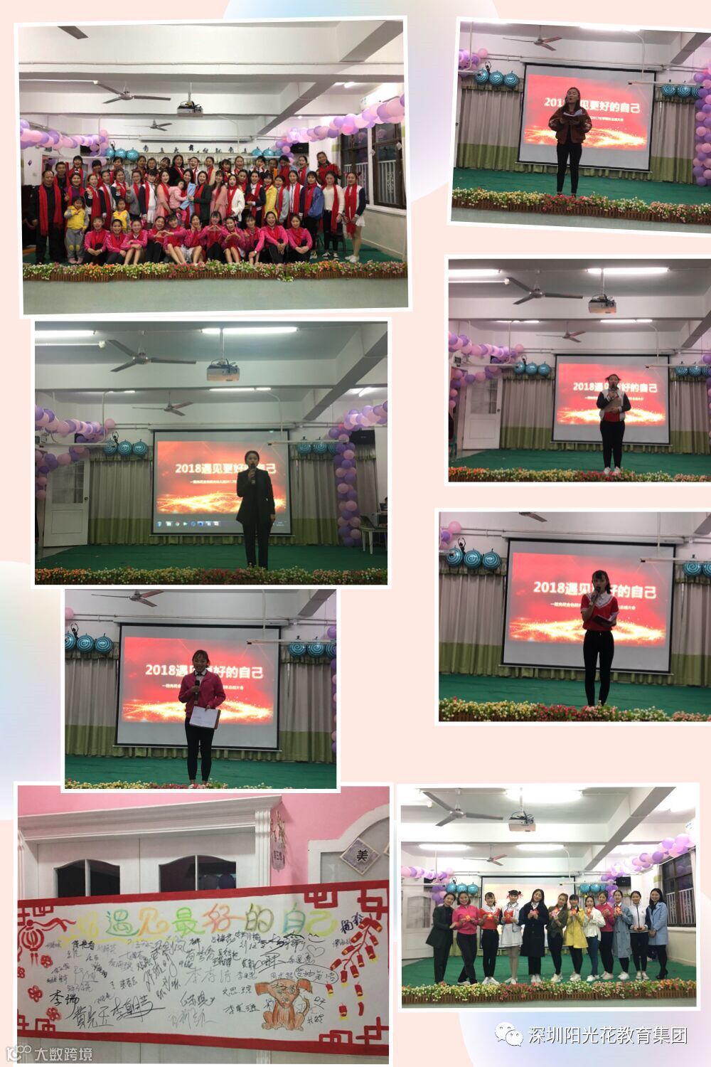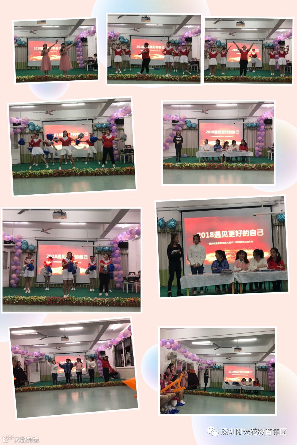 歌声袅袅辞旧岁,舞姿翩翩贺新春;新的一年,新的征程,新的祝福,新的期待。阳光花教育集团深圳总部金色阳光幼儿园全体教职员工今晚齐聚在音乐厅举行了《2018,遇见更好的自己》分享总结活动。首先是由我们各个年级组美丽大方的老师福。活动不知不觉接近尾声,但我们前进的脚步永远不会停驻,我们的激情永远不会褪却,我们永恒的凝聚力不会改变,因为我们是相亲相爱的一家人。美丽微笑,绽放的是对工作的热爱;春风化雨,传递的是对同事的亲情。我们骄傲,我们是人民教师;我们骄傲,我们是幼儿教师;我们骄傲,我们是阳光花金色阳光幼儿园幼儿教师。感恩亲爱的领导,照亮前方的路为我们指引,感恩亲爱的阳光花金色阳光大家庭,我们一路走来,因为有你们而更加美好。如果没有艰辛,收获不会如此美丽;如果没有跌倒,成功就不会如此精彩;点点滴滴,都融入进家人们的心。这一刻是美好的,这一刻是温馨的,这一刻是振奋人心的。新的一年,在坚实的奋斗脚步中,不屈不挠的金色阳光人将全力以赴,勇往直前,砥砺前行,取得2018的胜利。新的一年,在此,金色阳光幼儿园全体教职员工家人们新年快乐,万事如意,人旺财旺好运旺旺。