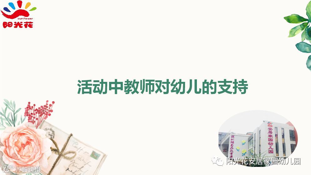 观摩结束后阳光花安居家园幼儿园张园长从教师对幼儿支持的维度:资源支持—能力支持—情感支持三方面为大家进行了《活动中教师对幼儿的支持》专题分享。