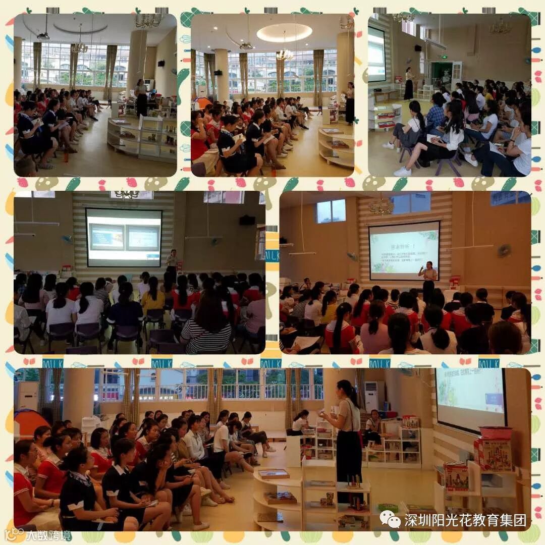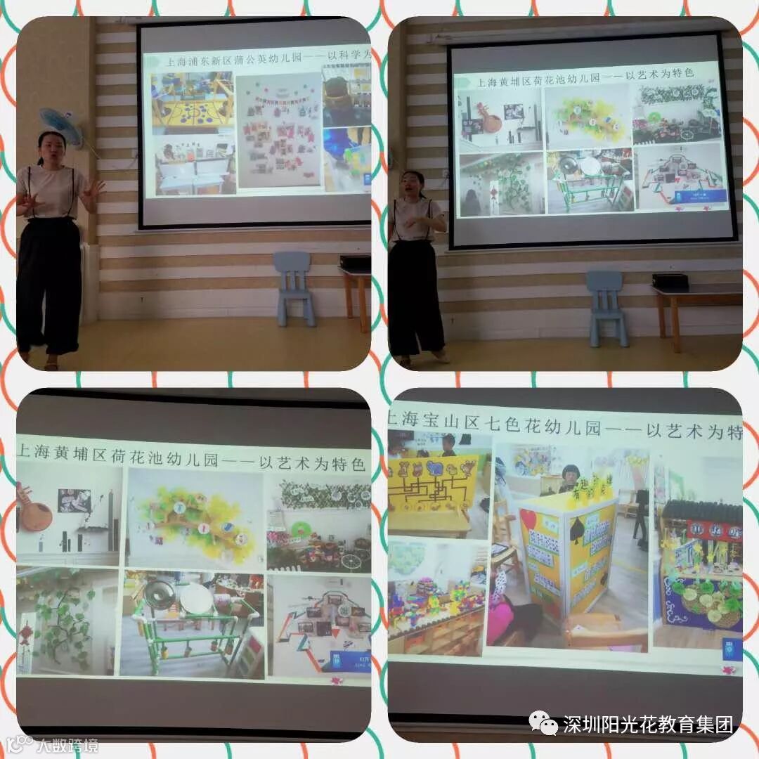 学无止境、活到老学到老、三人行必有我师……诸多的名人名言都说明了学习的重要性。有着十多年教学经验的陈园长,在虚心学习之后,上班的第一天马上把她在上海学到的内容与我们进行了分享。从以科学为特色的蒲公英幼儿园,科学贯穿所有区域;以艺术为特色的荷花池幼儿园和七色花幼儿园,自制打击乐、材料大而灵活、操作性强;以国际化为特色的乌兰幼儿园,月活动展示墙与安全互动墙的创设、对所有材料进行操作指引、教师教学活动中语言简洁明了、孩子百分百投入互动等等多方面进行了剖析分享。让我们对区域创设和教育教学方面有了更新的认识和理解,为我们的进步增添了新的知识力量。