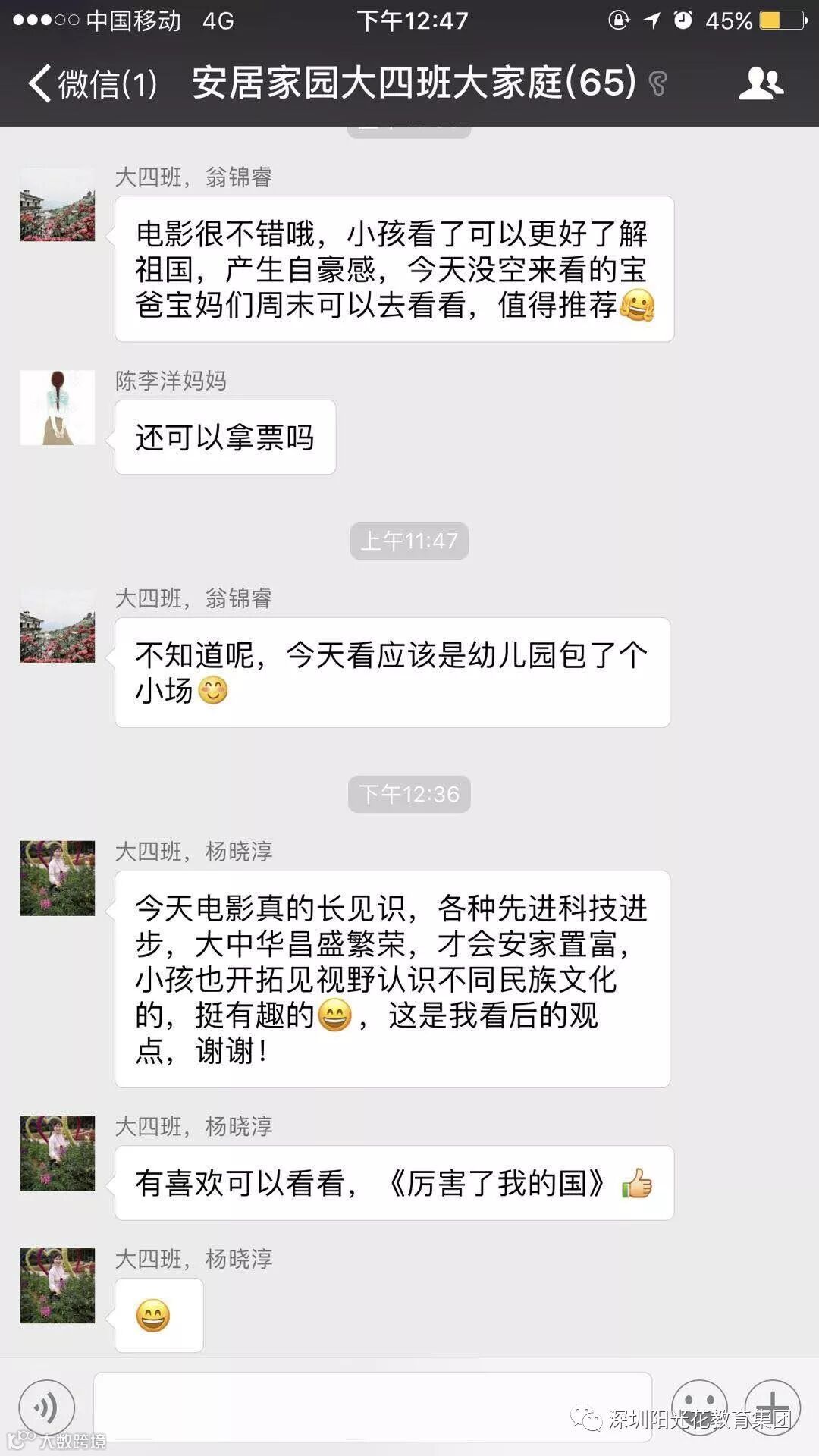 影片结束后,家长们都感触颇多,分别在班级群里分享了自己的感触以及对幼儿的教育意义!本次活动培养了幼儿爱国的情操,加深宝贝们在科技方面有了更多的认知,以及对科技的兴趣!同时感受到各种先进科技进步,大中华昌盛繁荣,才会安家置富,开拓了幼儿视野,认识不同民族文化!相信我们的宝贝们会更加大胆、探索更多有趣新奇的事物!