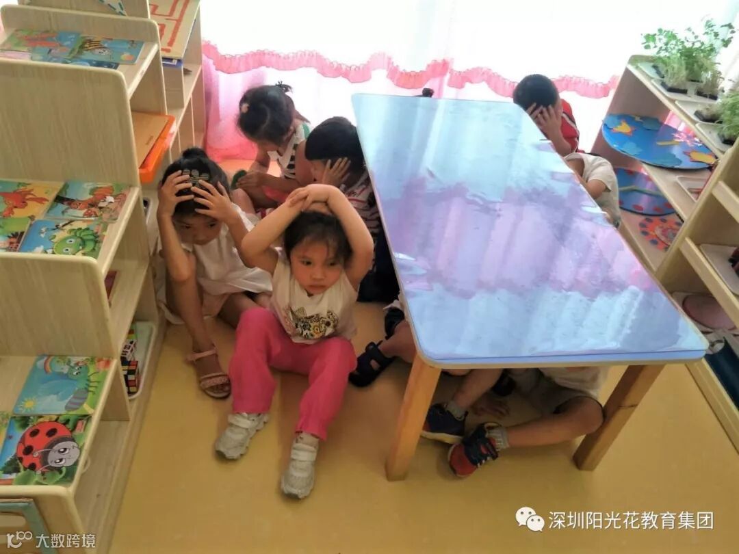 警铃拉响后户外活动的幼儿在老师的带领下井然有序的进入最近的教室躲避;在室内活动的教师及时关闭和反锁大门,组织幼儿在安全的地方安静躲避。
