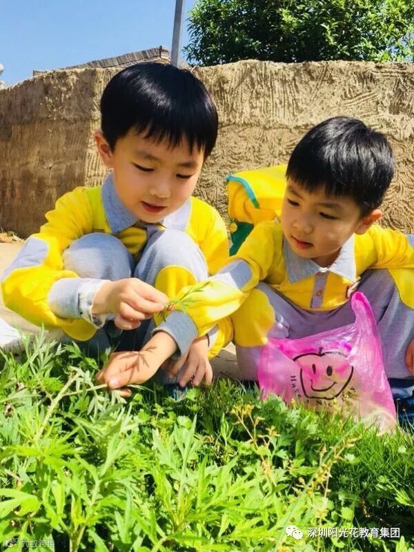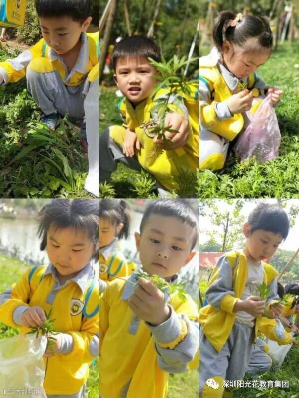 在采摘艾草的过程中,小朋友们一起探讨艾草的形状和气味。