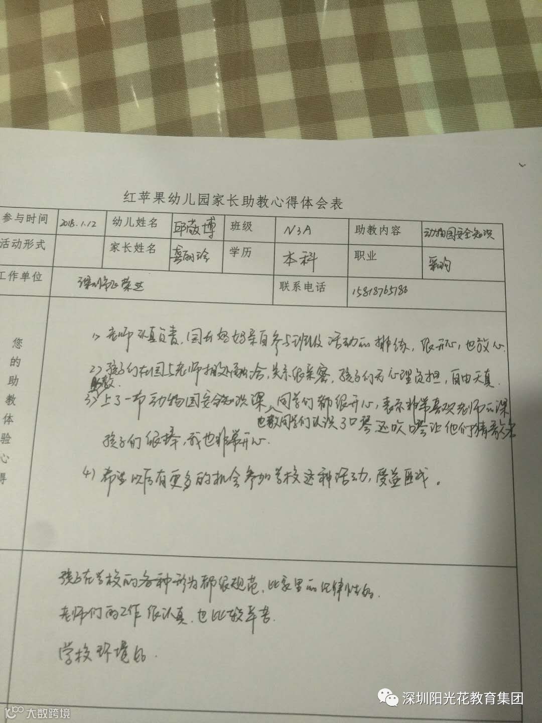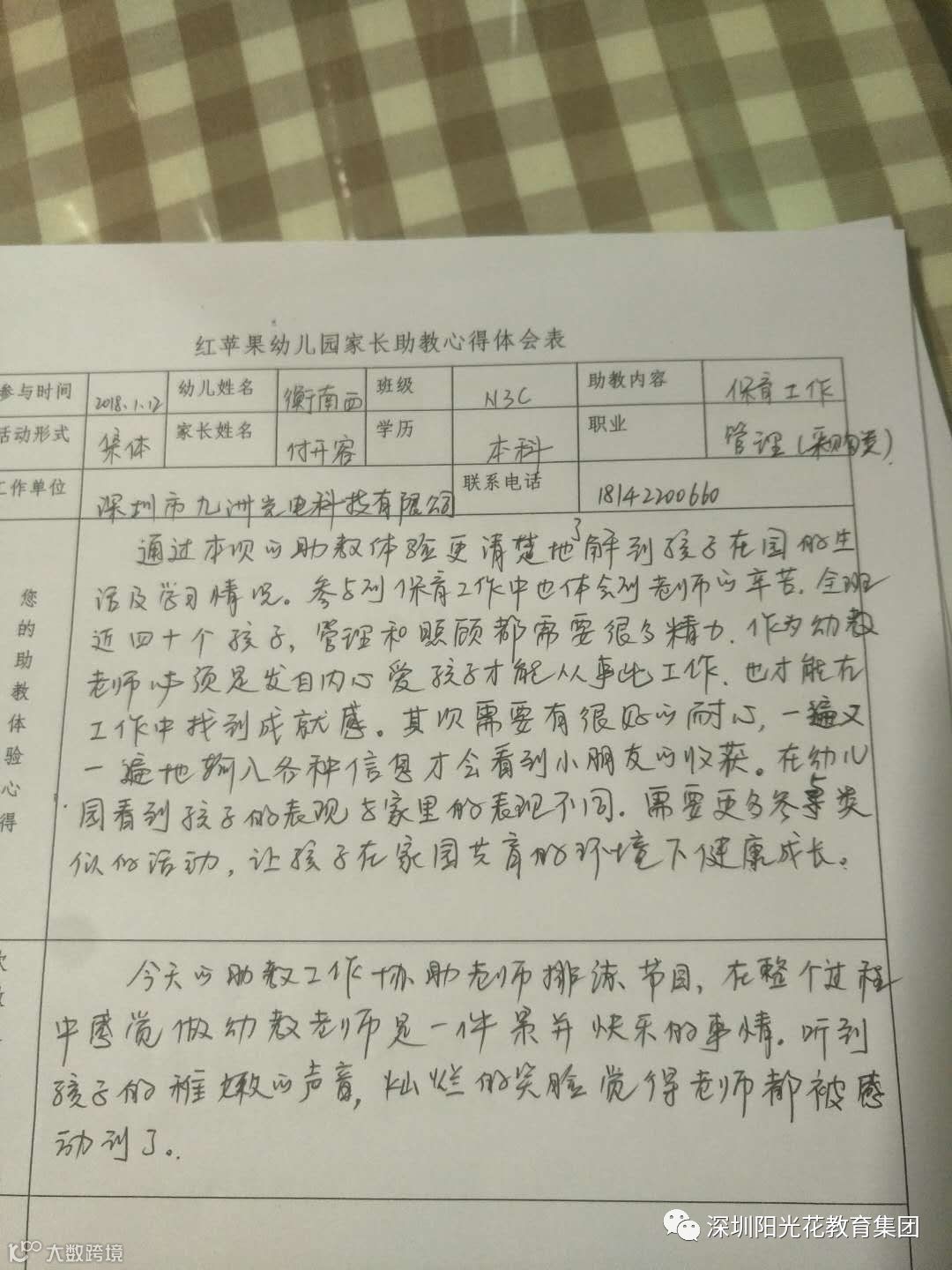 活动接近尾声,家长助教们写下活动的心得体会,体会到老师的不易,老师这样的爱心与耐心。