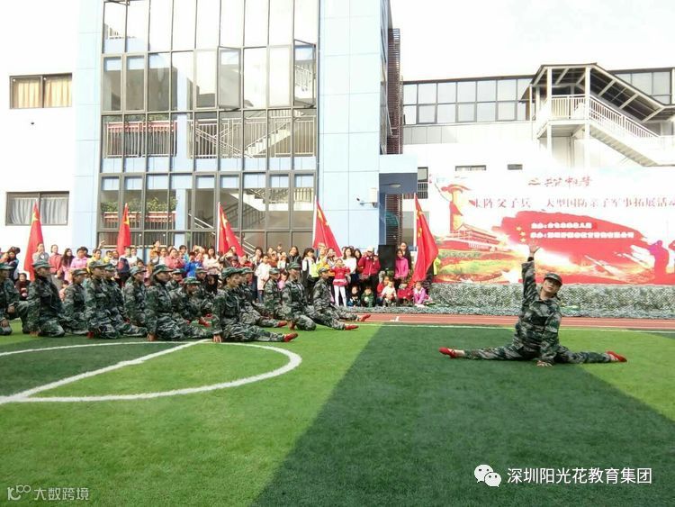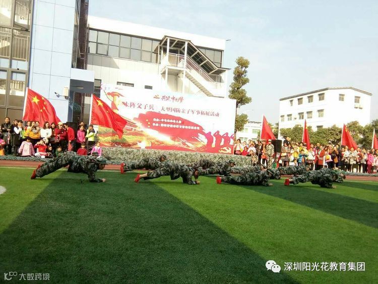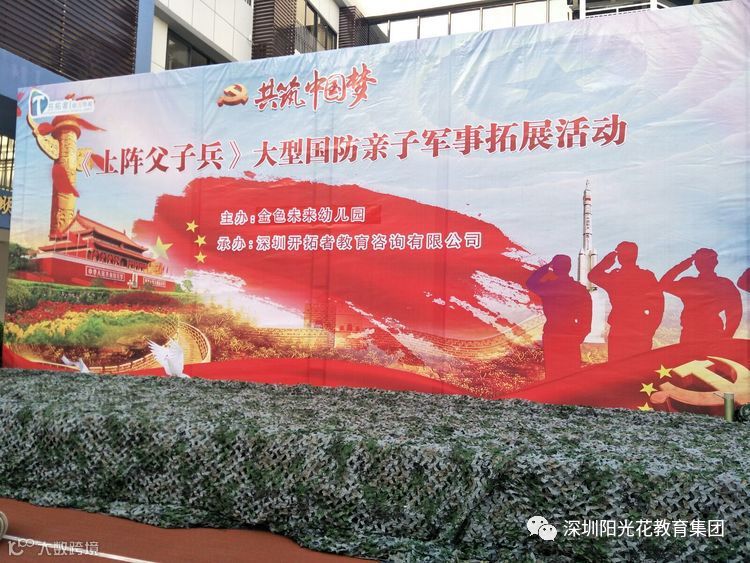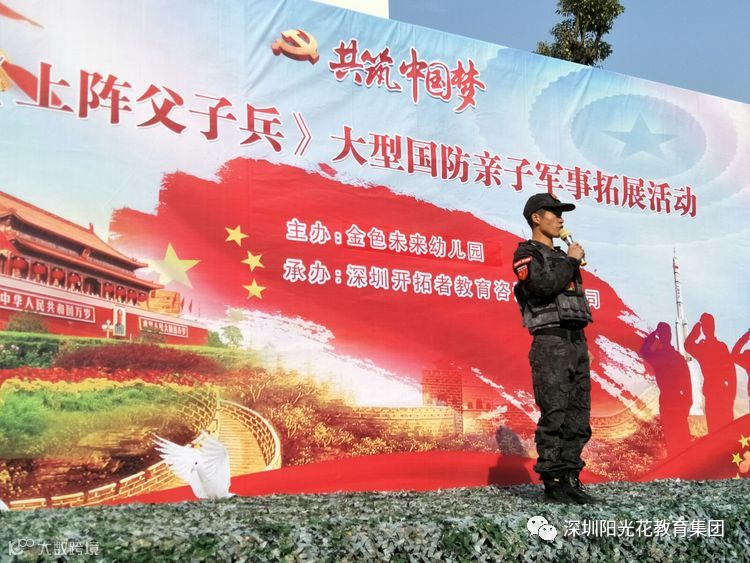 冬日如火,阳光灿烂,为了提高国防知识在幼教的传播,激发幼儿的爱国热情,同时使孩子们更好地领悟纪律的含义、规范的意义。孩子们学会了勇敢地面对困难,挑战自我、超越自我,更学会了坚强的面对困难、勇往直前。本次活动培养了孩子们的团队精神,集体意识,同时也为了更好的践行《指南》,实现家园共育,增进孩子与家长之间的感情,锻炼幼儿的体质。阳光花金色未来幼儿园于2017年12月9日上午开展了一场规模宏大的国防军事亲子拓展活动上阵父子兵。