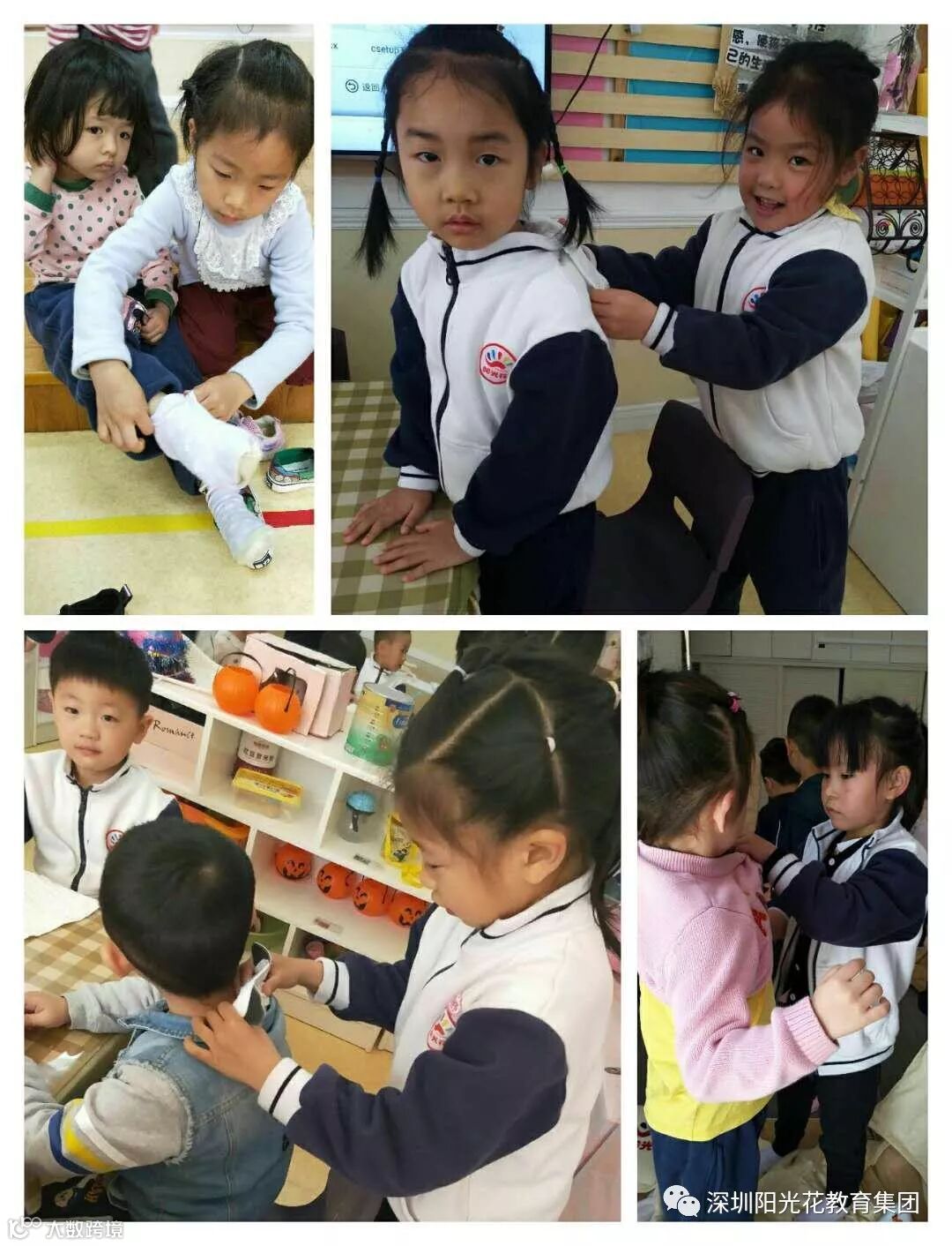 第二项任务,为小班的小朋友叠被子和穿衣服。灵活的身影,一张张整齐的被子被他们叠好了,接着他们开始为弟弟妹妹穿衣服,穿鞋子,他们的表现获得了小班弟弟妹妹和老师们的点赞。