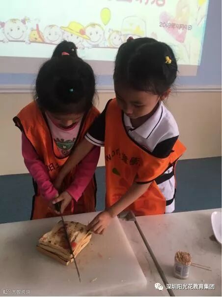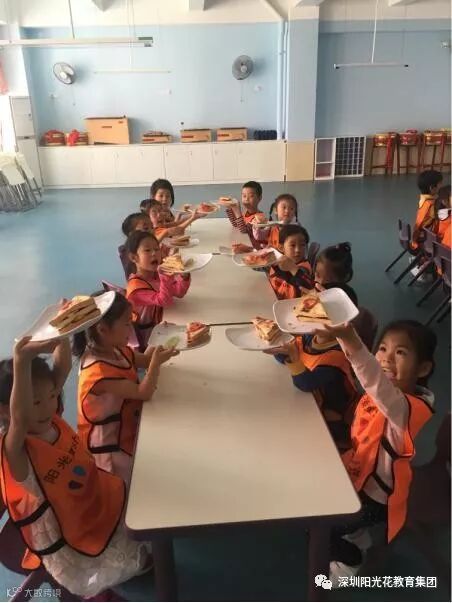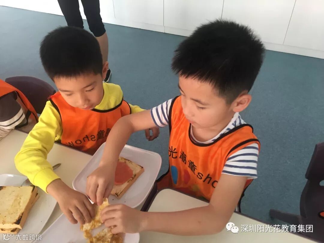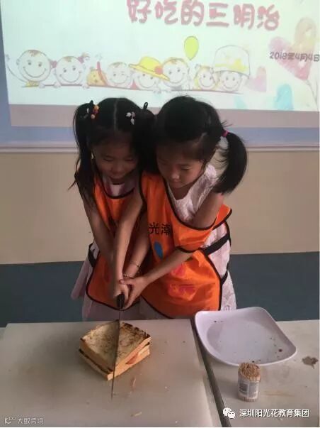 第二环节:潮宝们要亲手制作三明治啦!通过合作,潮宝们顺利完成了属于自己的三明治,然后亲手持刀把三明治成功切开,三明治完成啦!