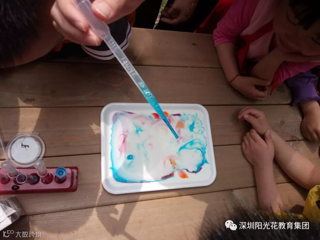 实验一:“牛奶动画” 科学原理:洗洁精含表面活性剂,它会破坏液体的表面张力,被扰动的牛奶带动色素翻滚运动,进而绘制出美丽的图案。