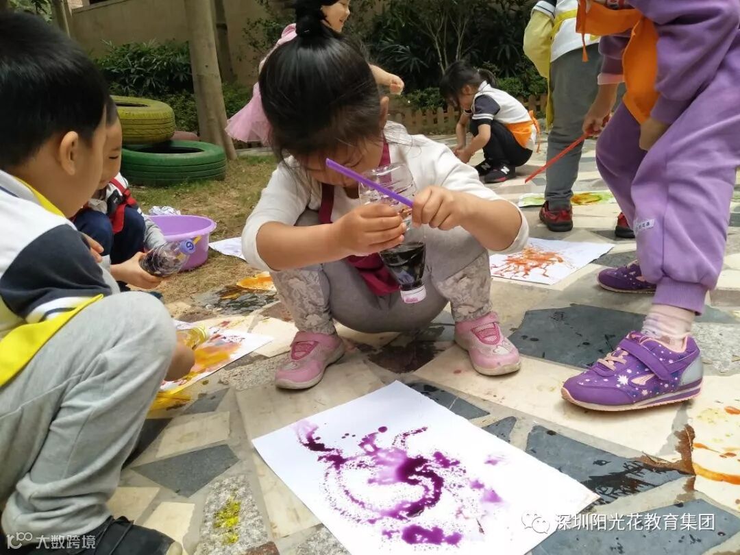 接下来由西瓜姐姐带领潮宝们一起动手操作,亲身体验进一步感知神奇的颜色,利用泡泡与多种可食用级的色素在自然环境中作画,潮宝们探索中也突发奇想,利用各种颜色混合完成了一幅幅作品。