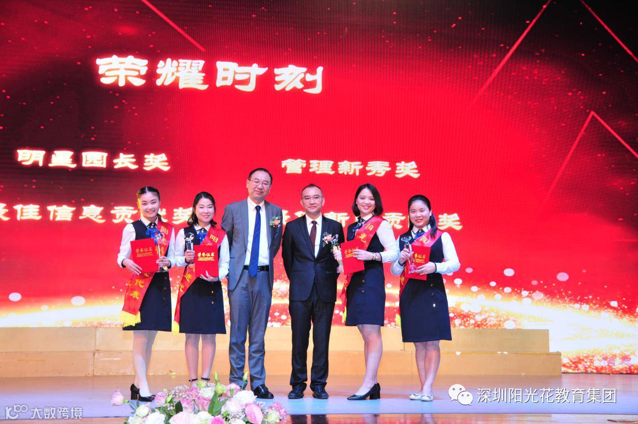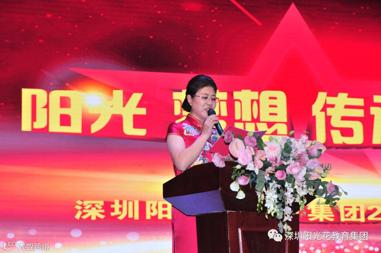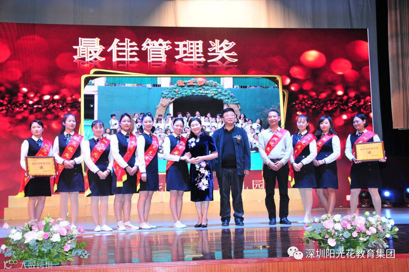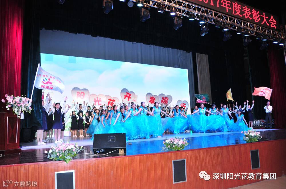 2017年11月26日,深圳阳光花教育集团2017年度“阳光 梦想 传承 绽放”表彰大会在光明新区文化馆隆重举行,参加本次大会的有深圳阳光花教育集团董事会成员及深圳15家幼儿园全体教职员,出席嘉宾有华南师范大学杨宁教授、华南师范大学刘军副教授、光明新区文体教育局包小红副局长、深圳市学前教育协会王琪琪会长、深圳市学前教育协会钱芳秘书长、广东省幼儿园评估专家、深圳市名园长工作室主持人、莲花二村幼儿园园长王微丽园长、深圳市实验幼教集团刘红喜主任、广东省学前教育专业委员会讲师团团长深圳市苗圃工程名师孙晓昕园长、光明新区教育局民办教育行政管理干部田清蓉女士、光明新区学前教育专职督学梁小芹女士、光明新区学前教育专职督学陈秀英女士、光明新区明日之星幼儿园董事长邬燕平女士、宝安区教育局学前教育科副科长潘琳女士、宝安区幼教集团理事长总园长兴华幼儿园园长焦艳女士、龙华区教育局教育科学前教育办负责人钟文忠先生,人数达1000多人,声势浩大、场面壮观,本次大会由王清董事主持,共分为四个乐章进行。