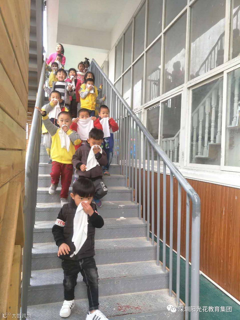 幼儿听到报警声后迅速逃生到操场