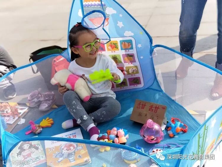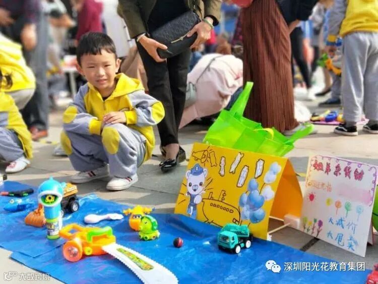 一个个"摊位"整齐干净,有玩具、幼儿图书、学习用品、手工制作、小食品、小饰品等玲琅满目。小朋友和家长坐在自己的摊位前,纷纷扮演起老板的角色,热情地向往来的顾客推销自己的商品,招揽生意,耐心为顾客服务。