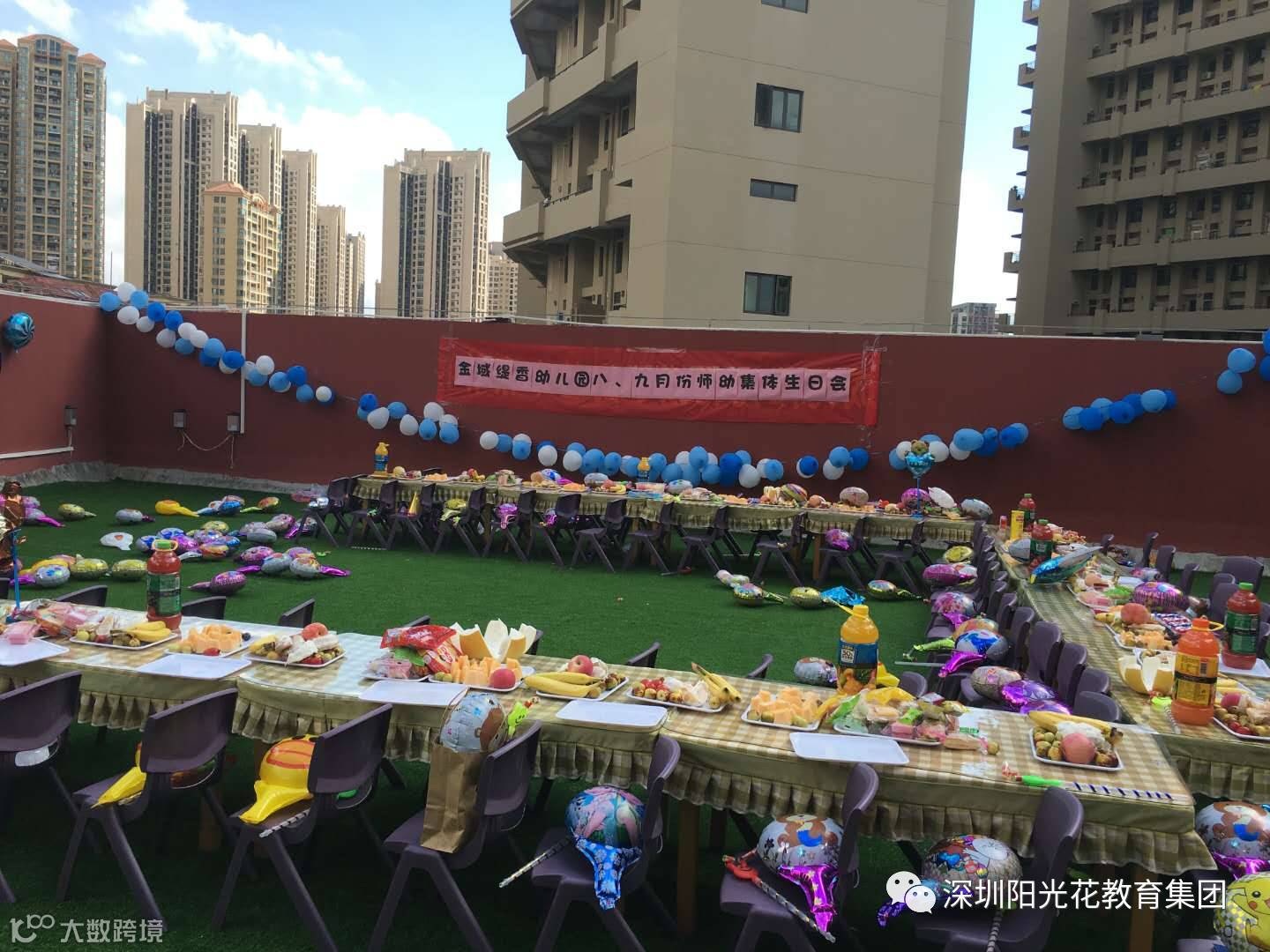今天是阳光灿烂的日子!今天是百花盛开的日子!今天是难忘的日子!今天是欢乐的日子!今天是金域缇香幼儿园“八、九月份师幼集体生日会的日子”!