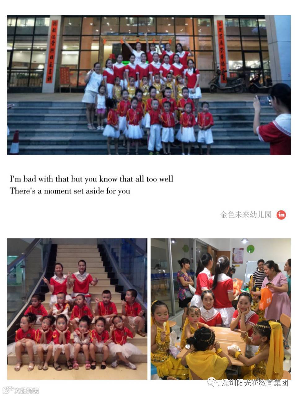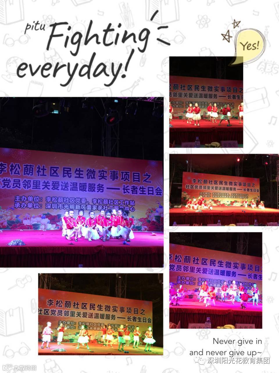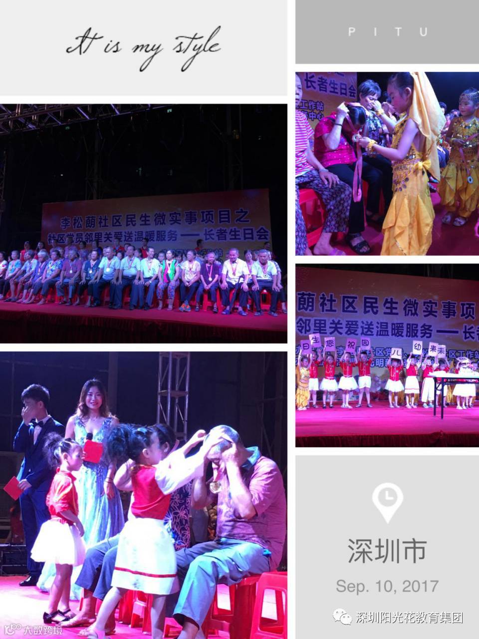 今天晚上19:00公明李松朗居委会开展了一场温馨而又充满欢乐的“长者生日晚会”。金色未来幼儿园教师及小朋友精心准备了参加长者生日会的节目,以晚会的形式为社区80余名老人集体庆祝生日,现场在大班小朋友带来的《嗨、我的梦》拉开了序幕、接下来金色未来的宝贝们和老人寿星代表一起吹蜡烛、切生日蛋糕,齐唱生日快乐歌;为老人带上荣誉勋章。紧接着《印度舞》、《艺术口才串烧》等节目陆续上台表演,舞蹈和艺术口才的相互融合,将我们阳光花的特色课程演绎得淋漓尽致。教师的快板表演《文明礼仪伴我行》把长者生日晚会推向高潮,丰富多彩的节目获得现场观众一阵阵热情的掌声。这次老人集体生日晚会,让社区老人深受感动,真正让老人们体会到老有所乐、老有所养。阳光花金色未来幼儿园作为李松朗社区的联动单位,走进社区,积极参与活动,充分展现了金色未来幼儿园孩子们活泼可爱,积极向上的精神风貌,同时也加大了宣传力度,让家长、社会公众进一步了解我园的工作,树立了幼儿园的良好社会形象。同时,在活动中,孩子们也感受到了浓浓的“生日”氛围,相信在社会各界、家长朋友的关注和大力支持下,金色未来幼儿园的宝贝一定会健康、快乐的全面成长。九月金秋,教师是这个季节的主人,空气中洋溢着感含师恩的浓情。此时此刻,金色未来幼儿园全体教职工用诚挚的情感祝愿我们阳光花家人们——节日快乐!
