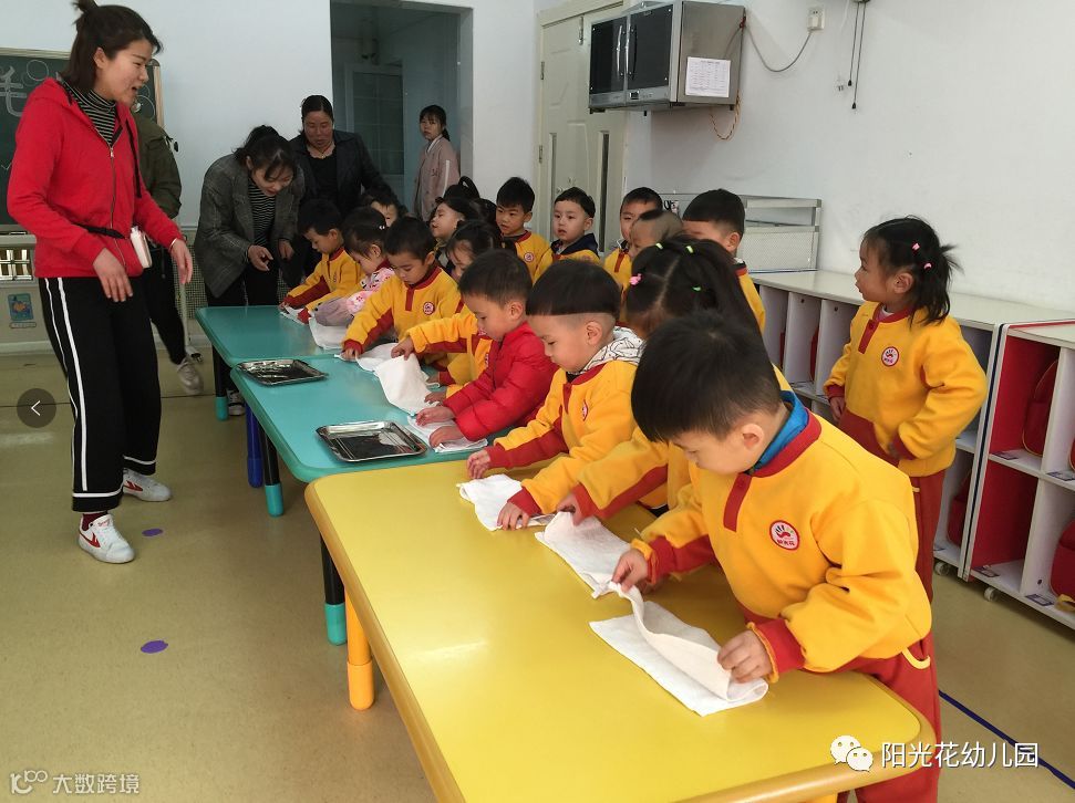 叠毛巾环节,叠毛巾的宝贝很专注,认真地将毛巾折叠整齐。有的孩子虽然动作有些迟缓,但他们仍然认真地做好自己的任务。