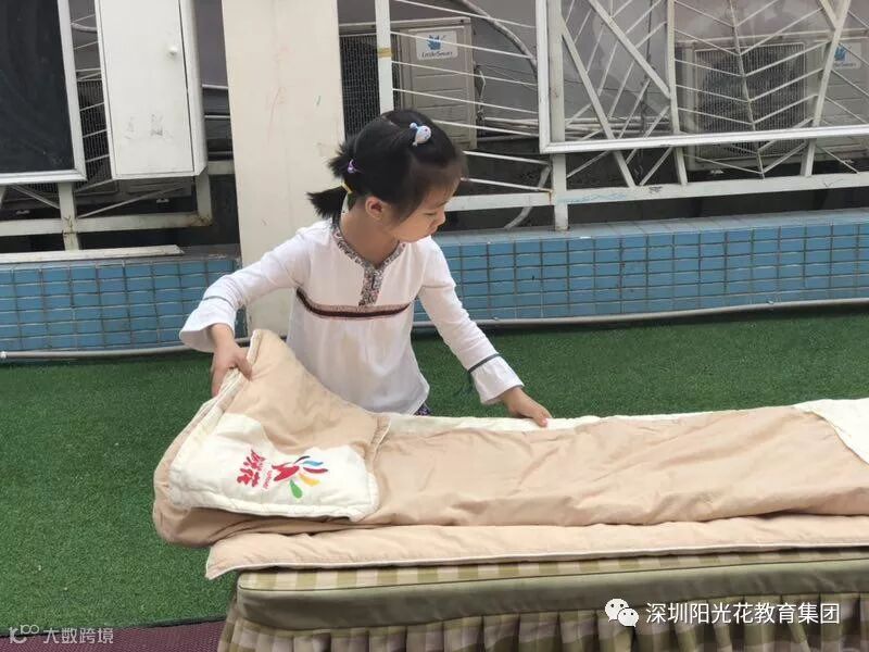 活动根据不同阶段幼儿的年龄特点和发展水平,以年级组为单位,制定了比赛项目,大班组——“叠被子比赛”。