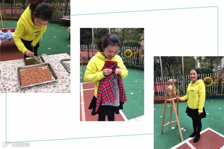 比赛规则:由向老师进行示范,每人先夹5颗花生,夹完后去选择一件衣服穿起来扣上,扣完后敲锣;