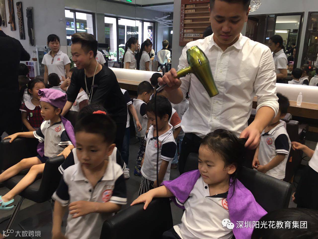 我们的四位小朋友头发已经洗好啦,理发师给我们的小朋友们现场吹起了头发,结果我们的宝贝们都要试一试,你挤我挤非常热闹。