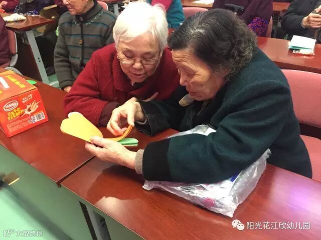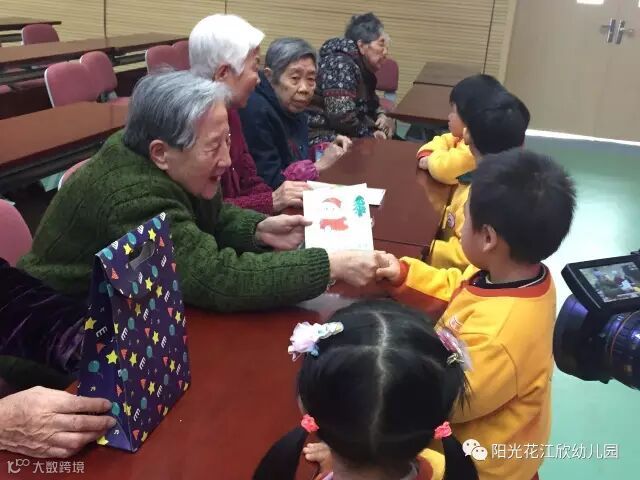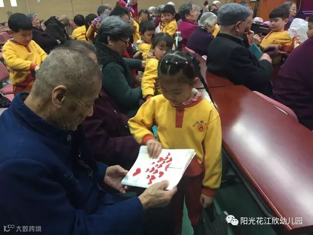 老人是社会的财富,更是生活的宝典,让我们怀着一颗感恩的心,关心老人,关爱老人,让我们身边的老人幸福快乐的生活。今天江欣幼儿园的小朋友还为敬爱的爷爷奶奶们准备了一份小惊喜,孩子们纷纷拿出自己准备的小礼物和小贺卡走到爷爷奶奶身边,把对他们的美好祝福送给他们。