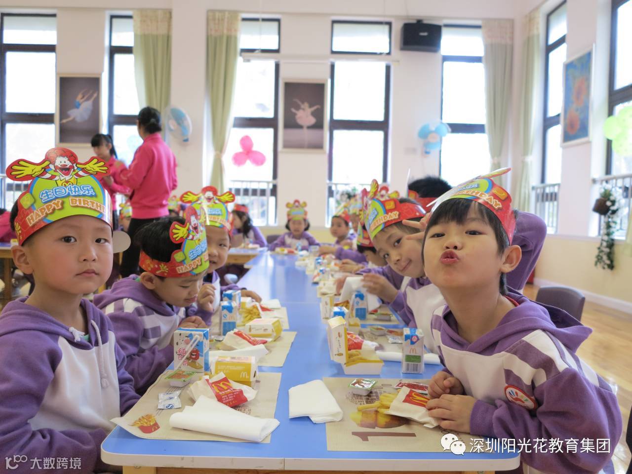 我们请来了麦当劳的小凤姐姐,给小寿星们个个戴上生日礼帽,大家合唱唱生日歌、许愿、吹蜡烛、送祝福、拍照、分享麦当劳汉堡、薯条、鸡块,一个个活泼可爱的孩子、一个个精彩的活动、一句句祝福语、一串串欢声笑语充满了幼儿园的整个音体室。
