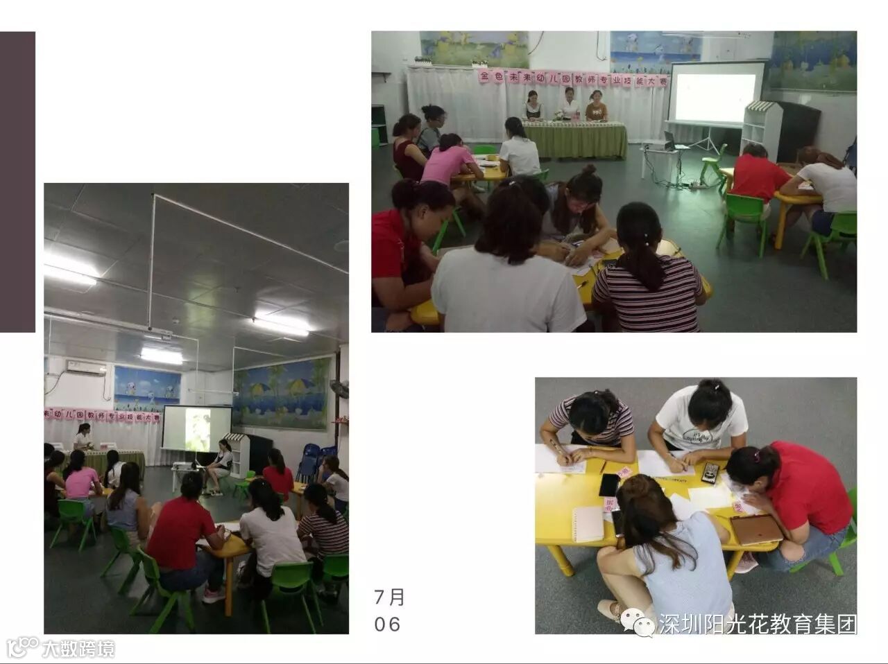 七月是一个金色的季节;七月是一个收获的季节;为提高我园教师的整体素质,加快教师的专业成长,促进我园健康、快速的发展,金色未来幼儿园全体主配班今晚6:30隆重举行“我参与,我展示,我提高”教师技能技巧大赛!
