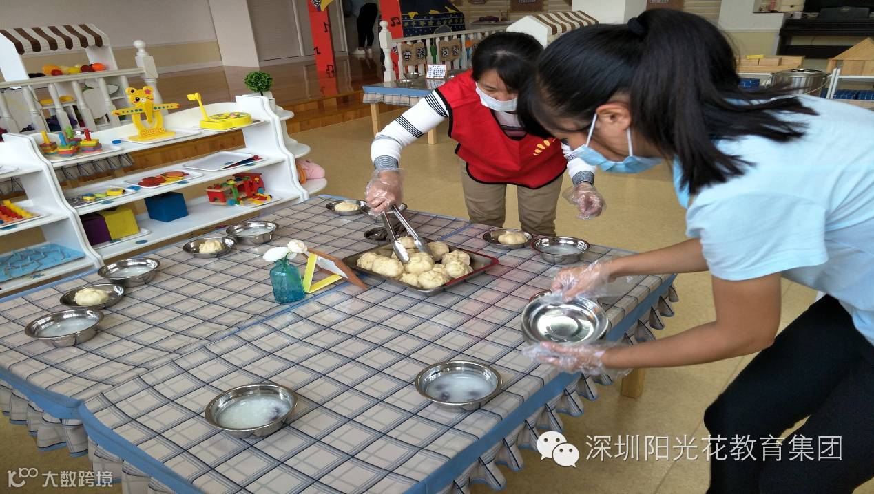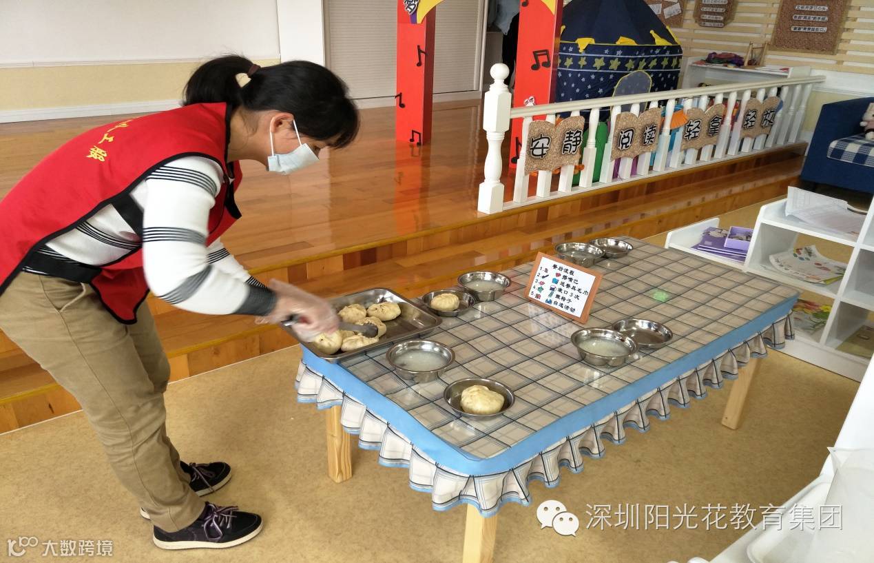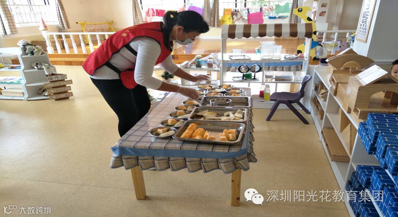 从早上幼儿入园——中午幼儿进餐,由班级老师带领着家长一起体验保育员半日工作流程;如:(进厨房拿餐、拿水果、拿餐具等都是戴手套跟口罩按照要求进行)。