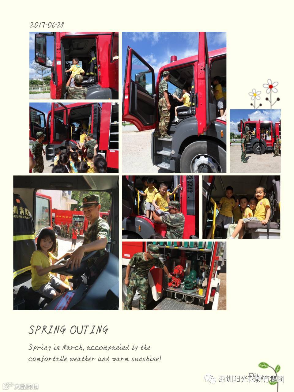 参观完各种消防器材之后,消防叔叔带领着孩子们参观了消防车,一一讲解消防车的用途和各种设备,并进行了实践操作,还邀请了孩子们上消防车,亲身体验当小司机的感觉,让孩子们做一名“小小消防员”。参观完消防车之后,为了感谢消防叔叔的辛苦,孩子们也给消防叔叔准备了一份小礼物小红花和宝贝们精心画的画,当送给消防叔叔时,宝贝们甜甜的说一声:“消防叔叔,您辛苦了!”一张张欢快喜悦的笑脸给这次活动也画上了圆满的句号。
