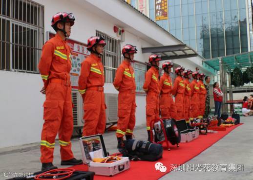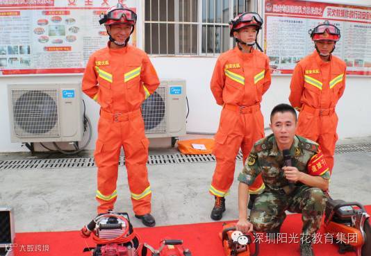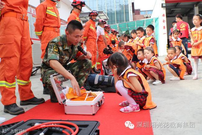 定位器、呼救器等各种器具,讲解消防器械的演变、消防服的穿着与消防员叔叔耐心细致地回答了孩子们的问题,并介绍了消防车上各器具的名称和用途,使孩子们认识了云梯、高压喷射枪、泡沫喷射枪、作用等。