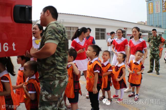潮宝们与消防员叔叔来了一次零距离的接触;小朋友们在老师的带领下来到消防大队后,当孩子们看到红色的消防车上装满了各种各样的消防工具时,迫不及待地向消防员叔叔提出了许多问题,天真的话语给大家带来阵阵笑声。