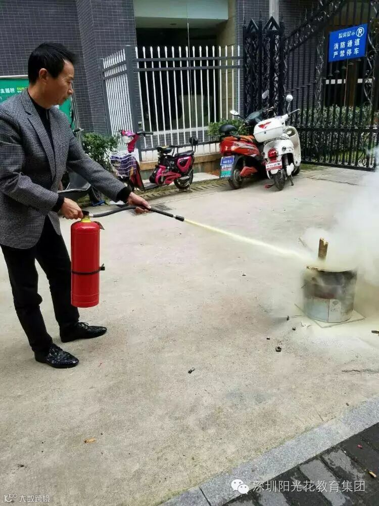 门卫贺师傅为小朋友们 演示如何使用灭火器灭火