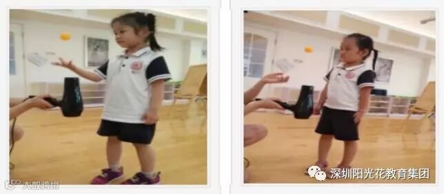 然后,由美丽的温老师给我们带来科学小实验《吹不走的小家伙》 老师先给吹风机接上电源,让电吹风的开口对着上方。打开吹风机,把乒乓球放在从吹风机敞口出来的热气流上,兵乓球却没有被吹走
