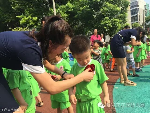 为新生小朋友佩戴小红花