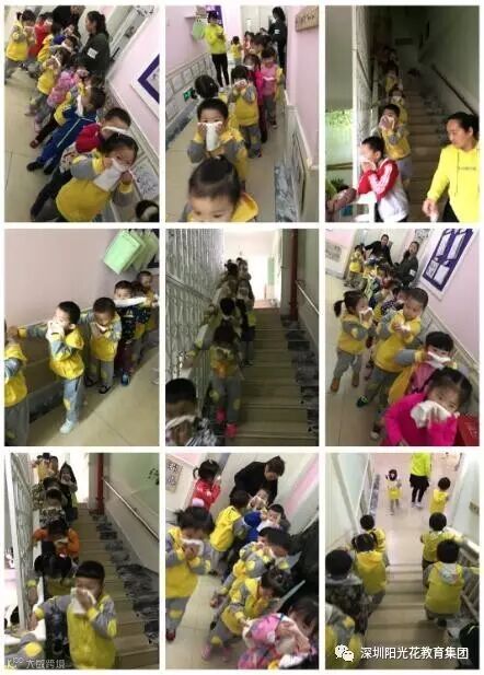 各班幼儿用手帕或衣袖等捂着口鼻,猫着腰有序地按指定路线“逃生”,班主任带着本班幼儿有序地疏散到指定安全区域。