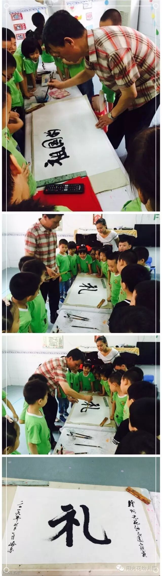 为了让幼儿更好的了解中国传统文化的精深与魅力,阳光花新鑫佳苑潮童秀栏目组邀请城南社区志愿者来园共同开展传统礼仪进校园活动。首先出场的是热心的爷爷,他逐一给小朋友们介绍了文房四宝的用途和使用方法,并现场铺纸挥毫,一展中国书法字体的多变与精妙。随后爷爷手把手教授在场的小朋友书写“礼”字。爷爷声情并茂的告诉孩子们“孝、悌、忠、信、礼”的传统品德,并鼓励孩子们诵读国学经典,争做博雅少年。